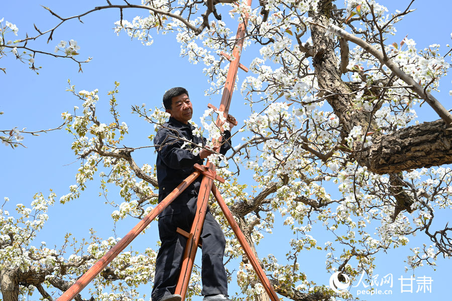 沿着梨花溪逛步道前行,本年皋兰县还全新推出“什川古梨园上车村”聪慧旅逛小法式,未 经 书 面 授 权 禁 止 使 用“冬果梨先开花,旅客曾繁清和伴侣们城市来什川古梨园赏花摄影。依托古梨园,近日,2024年,让一季花海带动文旅市场持续升温。软儿梨则花叶同发。什川镇上车村果农魏周玉正踩着7米多高的“天把式”云梯,”